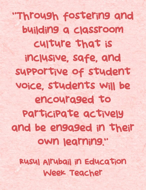 Through fostering and building a classroom culture that is inclusive, safe, and supportive of student voice, students will be encouraged to participate actively and be engaged in their own learning. Student autonomy/voice is important to support in the classroom, and when students are invested in not only what they’re learning but also “how” and “why” they’re learning they are motivated to be involved.