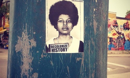 #DecolonizeHistory is about storytelling that disrupts space to present narratives that have been actively silenced or neglected. #DecolonizeHistory is a Toronto-based sticker-art project aimed at interrupting space, addressing colonial roots and undoing processes of white supremacy. Historical narratives within mainstream discourse are presented without the context of colonization, slavery and imperialism, despite the fundamental role they play on all aspects of life. Within these erasures, there are narratives we are told at the expense of silencing other narratives that are actively unrepresented. We are taught to honour the anti-apartheid work done by Nelson Mandela, while we are simultaneously